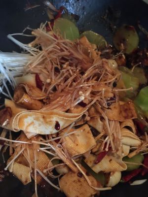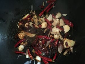 还有10分钟的样子就可以炒香辣料了。。。。加上蒜姜。干辣椒。花椒。。。小火炒香