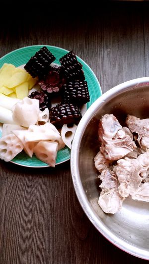 排骨泡水20分钟洗净,玉米洗净切段,莲藕洗净削皮切块,准备大葱段、姜片。干香菇3到4个温水泡洗备用。