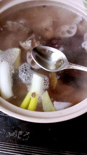 砂锅倒入水,放入焯好的排骨,葱段、姜片和干香菇大火煮开。然后倒入少量料酒,转小火炖煮20分钟。