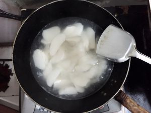 锅里倒入水,加入少许盐,烧开后放入山药煮一会,这样可以去除山药的粘汁