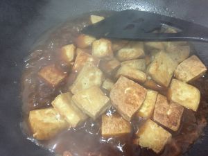 另取一口锅,倒入糖醋汁,烧开后勾芡,调好稠度,下入豆腐翻炒。