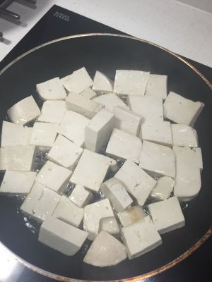 豆腐切1.5厘米左右的方块,平底锅放油,油量要稍多,油热之后放入豆腐。