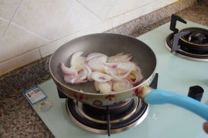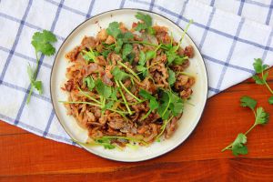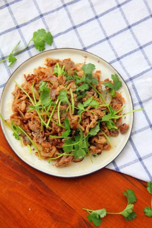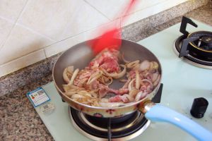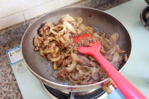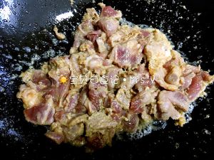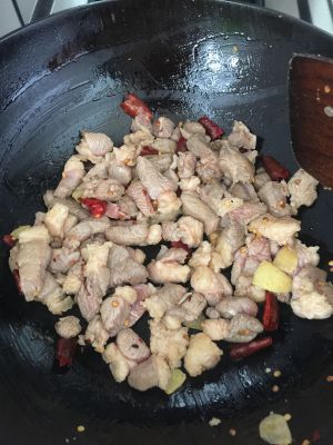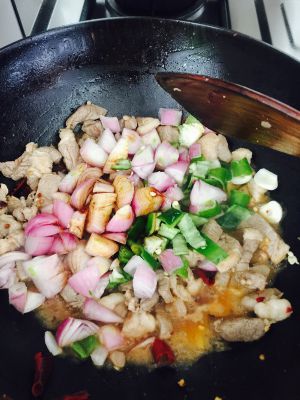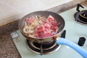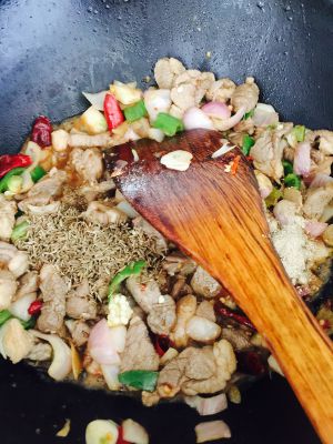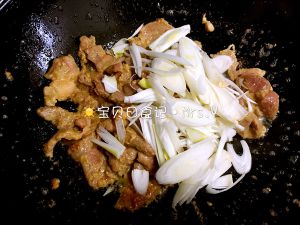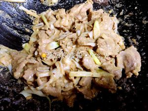 最后,用干净锅重新烧油,温热的时候把姜放进去,炸出香味可以去疝,但不能炸胡。然后放入大葱马上翻炒一下,接着就把肉和其他配料一起下锅,然后添加一点开水防止沾锅,放盐,味精,搅拌起锅。葱不能炒的过熟,否则会感觉腻