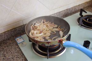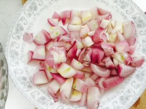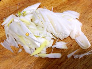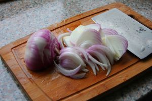 洋葱剥去外层,洗干净,一切两半,平的一面朝下,切成条状。