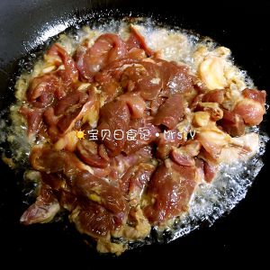 羊肉刚下锅会出水,并粘在一起,变成一坨,保持大火不断翻炒等断生之后,羊肉就会散开了。