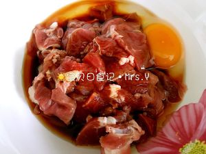 加入料酒、酱油、1颗鸡蛋、加入少量面粉。