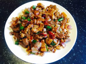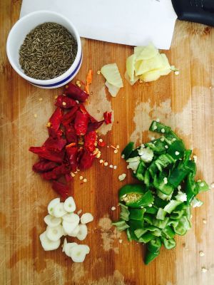 5分钟时间备料吧?辣椒青、红;姜;蒜;孜然.