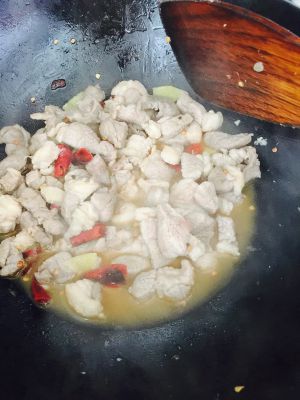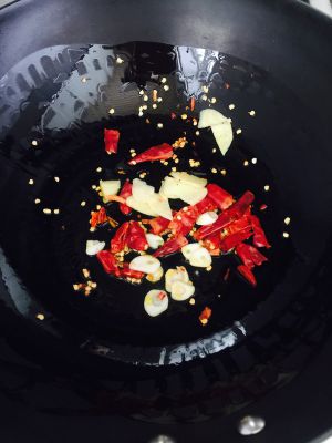 锅里放油(不能太热,放干椒会糊锅)干椒、姜、蒜片少许,炸出香味