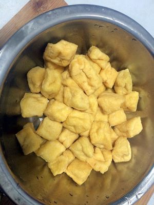 豆腐切块,我切的有点大了。。放冰箱恒温里冻几个小时会比较好切不容易碎