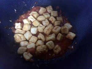 放盐,糖,鸡精调味后放入煎好的豆腐翻炒至收汁即可