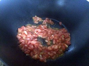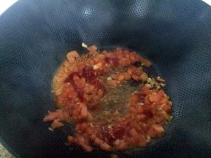 油热后,葱姜入油 加入西红柿,盐和十三香,炒到西红柿脱皮,大概四五分熟
