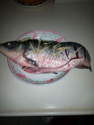 鲫鱼去鳞和内脏洗净,在鱼身上均匀的划几刀,用盐和料酒按摩鱼身,和姜片一起腌制10分钟