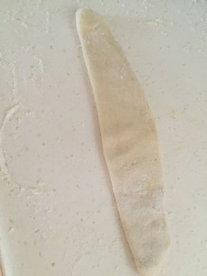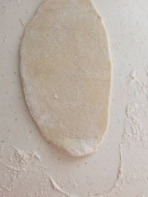 弄一块女生拳头三分之二的面汤,用擀面杖把面团弄成这样的椭圆