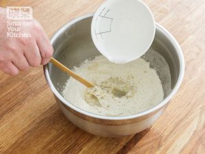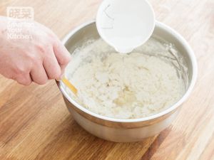 把精制粉,糯米粉,盐,精制油放在容器中,加入开水冲成雪花状。
