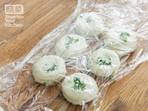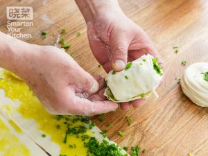 包裹起肉糜和葱花,从上往下卷起。