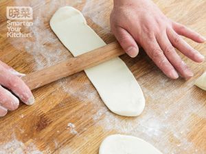 把面团用擀面杖擀薄。