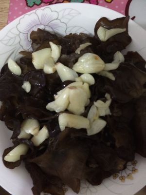 将爆香的蒜头浇在木耳上