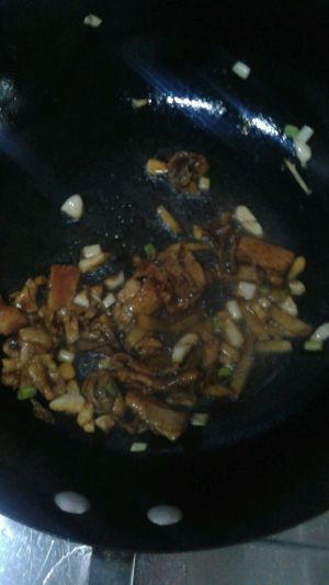 下五花肉片,稍加煸炒,即下煎好的豆腐片。翻炒片刻,加入酱油(我把老抽当生抽放了,有点黑,别跟我学哈)。