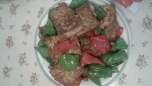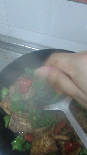倒入少量的油,大蒜爆香,放入青椒翻炒,青椒熟了就可以加入刚刚煎好的豆腐了。然后再滴入少量酱油,鸡精。翻炒几下就可以出锅了。