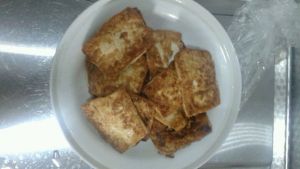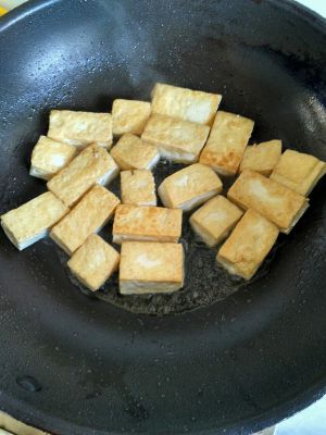 豆腐切小块,热锅冷油摆放锅中(怕油溅起)煎至两面金黄。