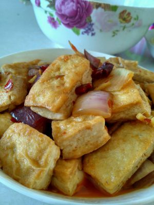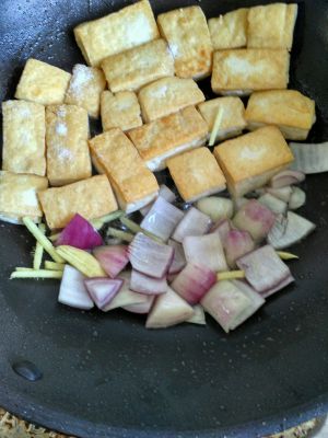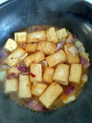 热锅冷油,煎豆腐两面金黄,加少许水,豆瓣酱,甜面酱,生抽