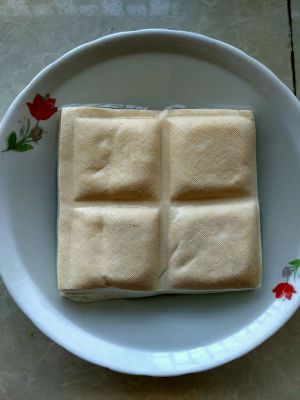 烧红油,加入适量的盐(可以使豆腐不容易碎,豆腐口感更好),将豆腐切片下锅煎,中火。豆腐变焦黄翻过来继续煎。煎好备用