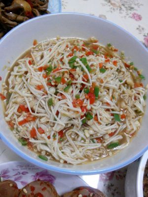 5、将葱油浇在金针菇上,入料汁拌匀即可。