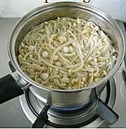 煮1000毫升沸水 将金针菇下锅 煮沸再煮一分钟 捞出过3遍凉水 挤干水份
