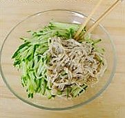 黄瓜洗净和熏火腿切丝;
