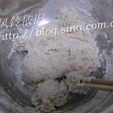 做开水面团,在盆里倒入面粉,扒开中间,倒入三之二的开水,用筷子搅成棉絮状,边搅视情况再加水