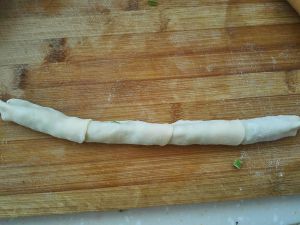 面醒好之后,抻一下擀成薄饼,然后像叠扇子一样的一层一层叠起来,在抻一下,从一头卷起