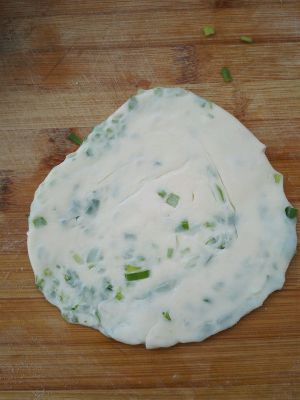面分成小剂子,擀开,抹上葱白油,撒上葱绿