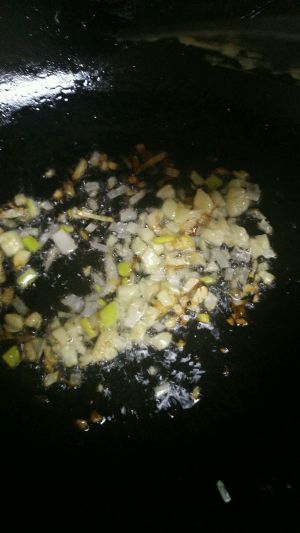 继续往锅里倒入少量油油热后将蒜末和葱末倒入锅中爆香