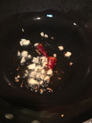起锅将花椒放入,开爆把花椒过滤出来,放入辣椒段、大蒜爆香