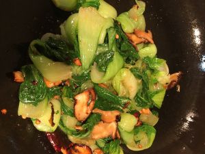 关火后,迅速将锅内所有食材浇在抄好的油菜上面。