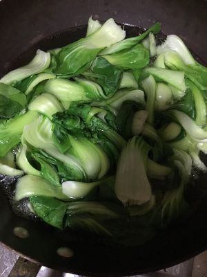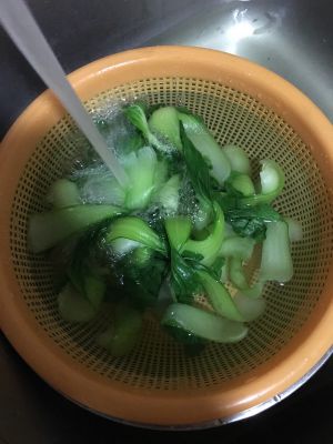 锅里烧水,加1勺盐,放入油菜戳水,煮熟装盘备用