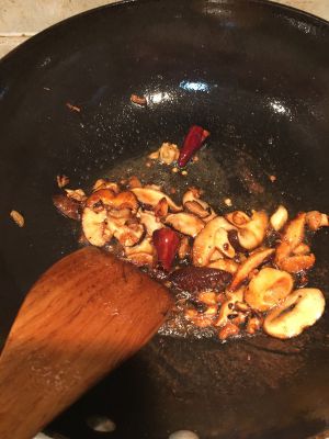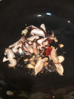 锅内热油,放入花椒煸香后,加入葱花,炒香,加入香菇,煸炒。