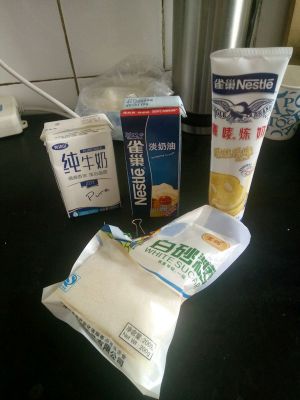 将淡奶油,牛奶,炼乳和糖放入奶锅,加热至糖融化就可以了,不必要煮开