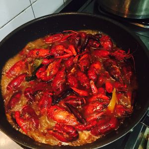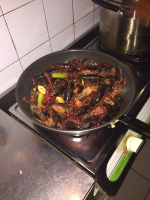 1 无水锅中加入足够的油 不用太多 也不用太少 七八成油温 放入洗干净小龙虾 炸 炸到小龙虾变红捞出 2 就着锅中剩下的油 放入葱姜蒜 炒香 调小火 加入香料(香叶 桂皮 八角 花椒 小茴香 草果...炒香 3 放入2勺豆瓣酱 炒出红油 之后放入炸好的小龙虾 翻炒一下 4 加入啤酒 刚刚没过小龙虾 5 加入剩下的调料 盐 鸡精 蚝油 生抽 老抽 十三香 料酒 冰糖 干辣椒 搅合搅合 6 大火煮开 盖上盖子 转中火20分钟 7 看汁水剩下不多的时候加入之前切好的青椒 搅拌一下 再加热几分钟 8 OK啦~ 哈哈哈