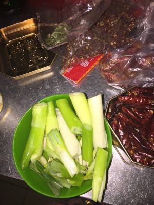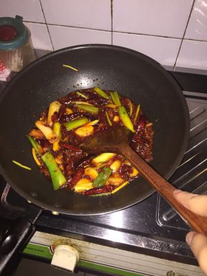 然后重新倒油入锅,下葱姜蒜爆香,然后下洋葱辣椒和花椒,一起煸出香味!