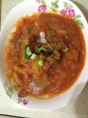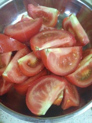 番茄切大块,炒翻沙。放入排骨汤内,加小半勺醋,然后小火慢炖再一小时。