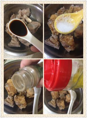 排骨放料酒焯水后依次放入酱油、盐、黑胡椒粉、油搅拌均匀腌制半小时以上
