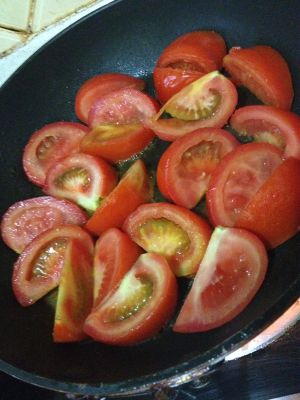 炒锅烧热,倒入热炒油,先把番茄倒入锅中,翻炒出红沙。