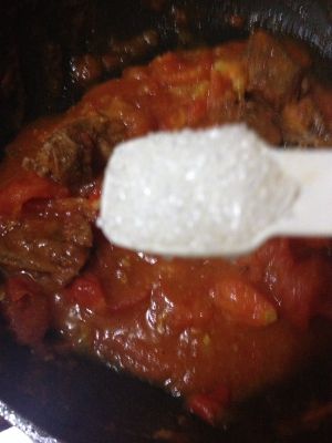然后将排骨倒入番茄汁里翻炒均匀,加入两勺糖调味