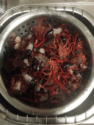 小龙虾去虾头,摘掉虾尾(中间)去虾肠,用刷子反复清洗,加料酒,盐搓洗,用清水冲到后滤干水