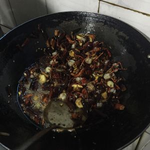 多放油,放入花椒大料干辣椒,郫县豆瓣,葱姜