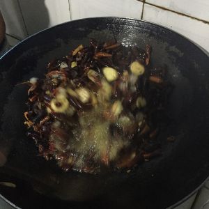 依次放入干辣椒花椒蒜姜