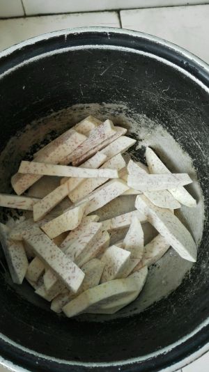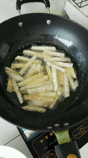 锅里加入油,多倒点,大概400ml左右,油少了不好炸。油热后加入芋头炸三四分钟~不确定熟没熟可以拿一条咬一口看看软了没,软了就熟了