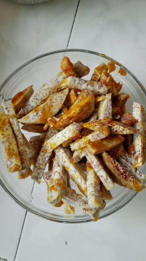 糖烧成棕色的糖浆,把炸好的芋条倒进去快速拌好