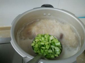 准备好瘦肉(用油,姜片,生粉,酱油腌好肉),皮蛋(切丁),西芹切丁,米2杯洗净泡一下。